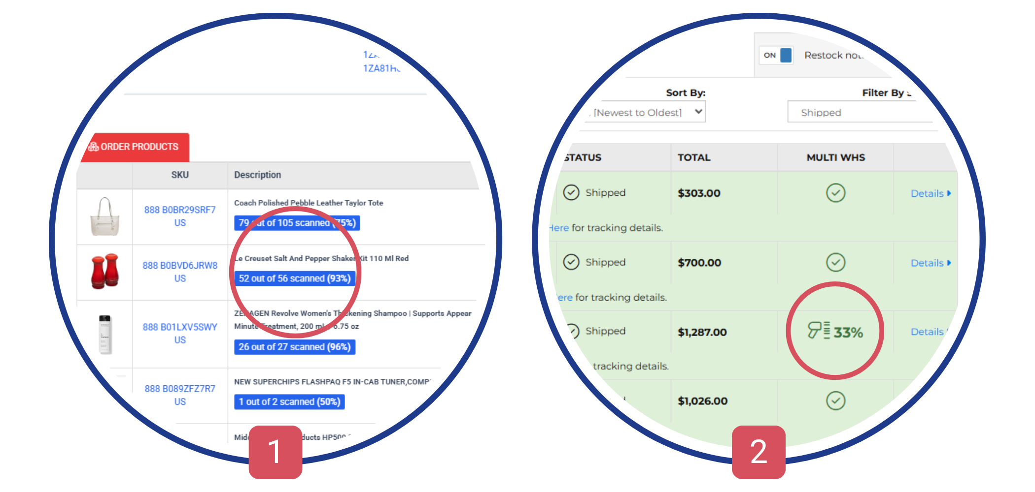 Vous obtiendrez ainsi des informations sur le pourcentage d'inventaire scanné de chaque commande, disponibles à la fois sur la liste des commandes et sur la page des détails de la commande.