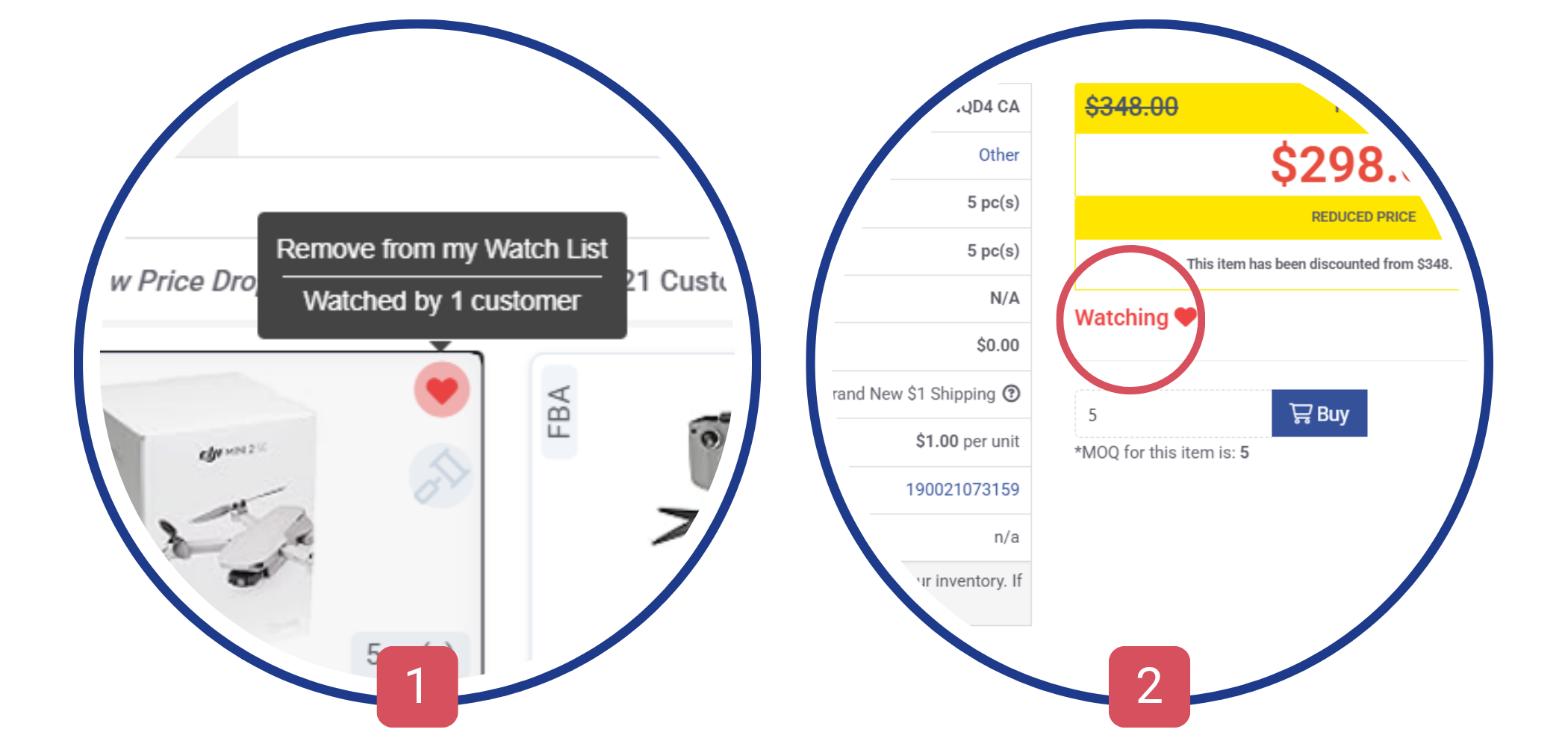 Si vous parcourez les articles, cliquez sur le bouton [1] sous Ajouter à la liste de surveillance ou cliquez sur Négocier [2] sous le prix, si vous avez ouvert la fiche produit.
