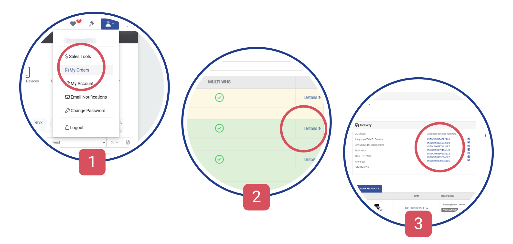 Cliquez sur Détails [2] sur n'importe quelle fiche de commande pour afficher toutes les informations, y compris l'état d'avancement de l'expédition et les numéros de suivi. [3]
